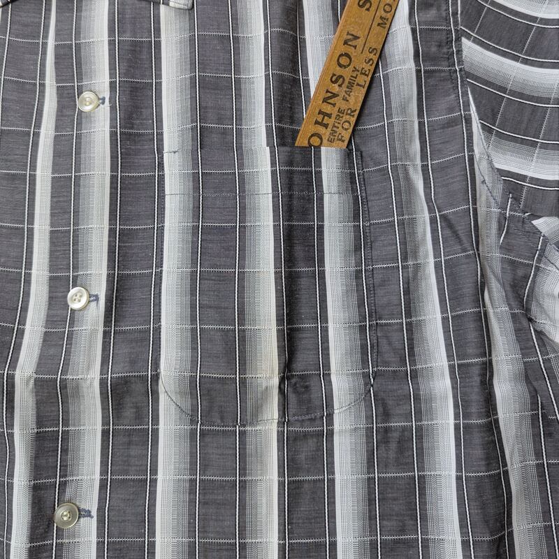 太ストライプ+格子織り柄、グレー系カラーでクールなシャツです。