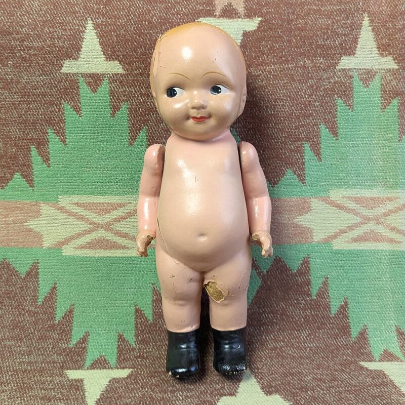 ドール:左右親指・左足に欠けた部分、左脚にダメージとリペア、頭部にやや大きな凹みキズ(キャップで隠れます)、腕のゴムの伸び(角度をつけてキープは難しい状態)、そのほかクラックや表面剥げ・色あせやシミ汚れ等は見られますが、顔がきれいですし飾った状態だと良好なコンディションの印象だと思います。