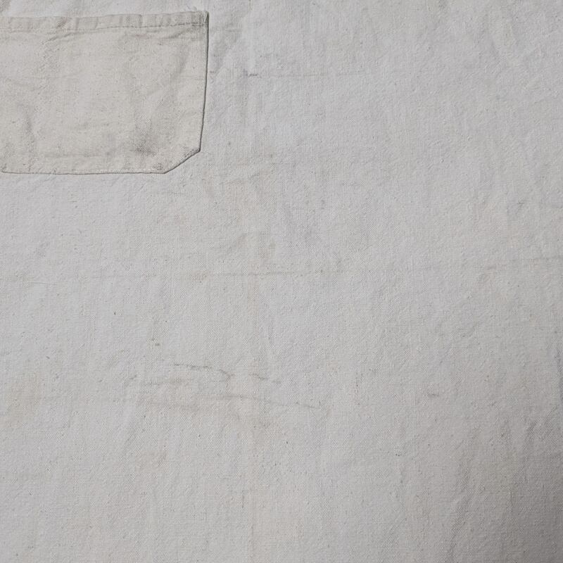 ポケット周辺や腹部を中心に薄くなったシミ汚れは見られますが、アジと思えるもので特別ひどいものはないように思います。ダメージは特になく、しっかりとした頑丈な生地感です。※紐は欠損していますので適当な紐をご用意ください。