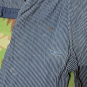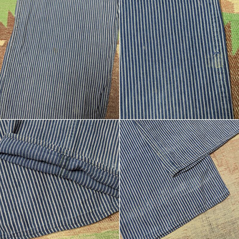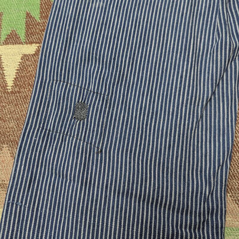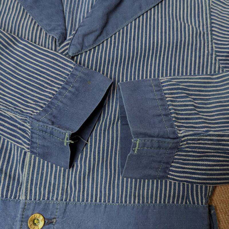 ヒッコリーストライプ×ブルー(ネイビー)の切替、メンズ物と比べるとライトウェイトの生地です。