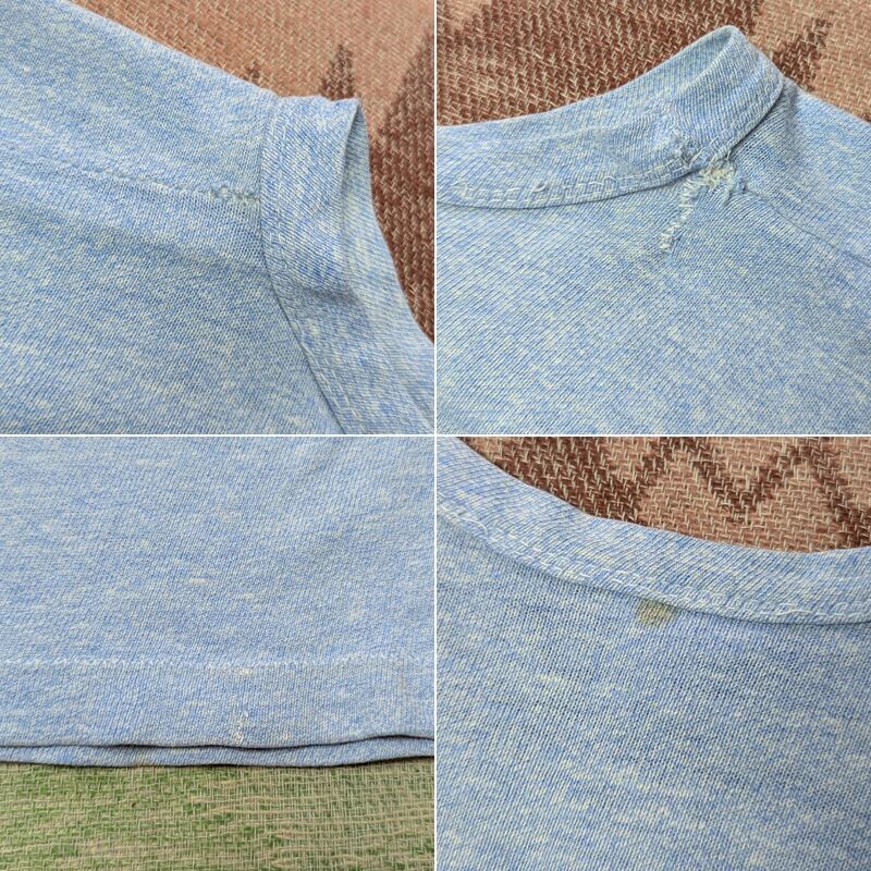 首周り~肩にステッチ抜けやリペア、裾周辺・首うしろ・袖にシミがあります。そこそこ使用感があり若干テロっとした風合いではありますが、アジを好まれる方には良い雰囲気、まだまだ着られるコンディションです。