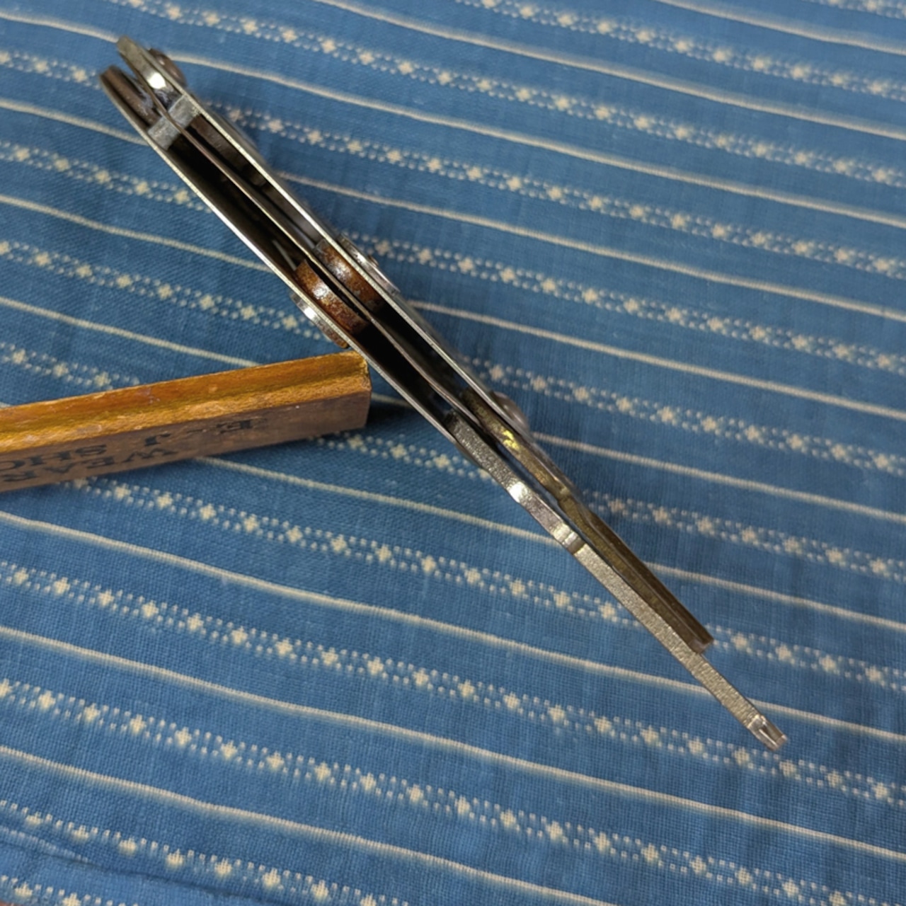 絵柄部分は色付きのセルロイド?が装飾されていたと思われますが、ほぼなくなっています。くすみ・黒ずみ・擦れ・錆び等は見られますが、問題なくお使いいただけるコンディションです。