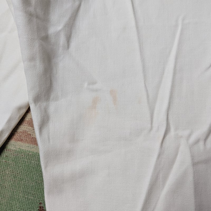 デッドストック。いくつか生産時の織りむら・右太もも裏に茶色シミがあり、その他かすかな保管汚れ程度はあるかと思います。白ですので、どうしてもであれば漂白で真っ白にすることもできると思います。特別目立つヤケ等のない良好なコンディションです。