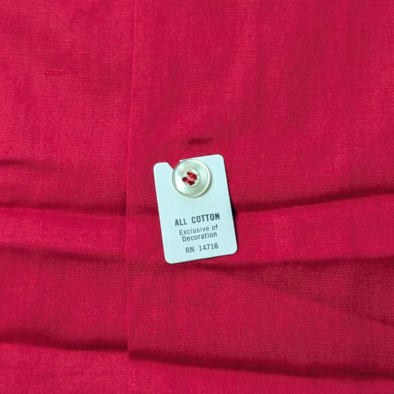 やや薄手で軽やかな100%コットン生地。パキっと鮮やかな発色というよりは、若干くすんだ感じの赤色ですので比較的着こなしやすい色味と思います。