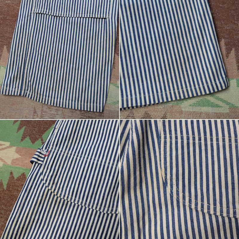 太もも前やサイド・ヒップ・裾周辺を中心にぼんやりと茶色シミや擦れ等によるネイビーの色落ち、サスペンダーにバックル痕のシミ、など見られますが、ストライプですので目には付きにくいです。右サイドのハンマーループにダメージがあるくらいで大きなダメージのないコンディションです。
