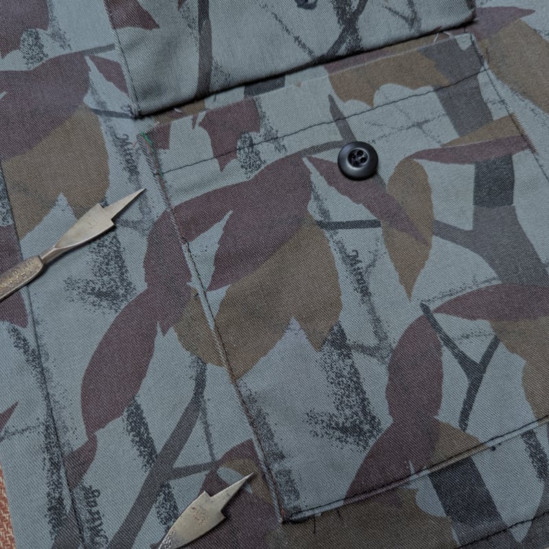 さまざまに着こなしが楽しめそうなグレー系のツリーカモパターン、軽い羽織りにちょうど良い生地感です。