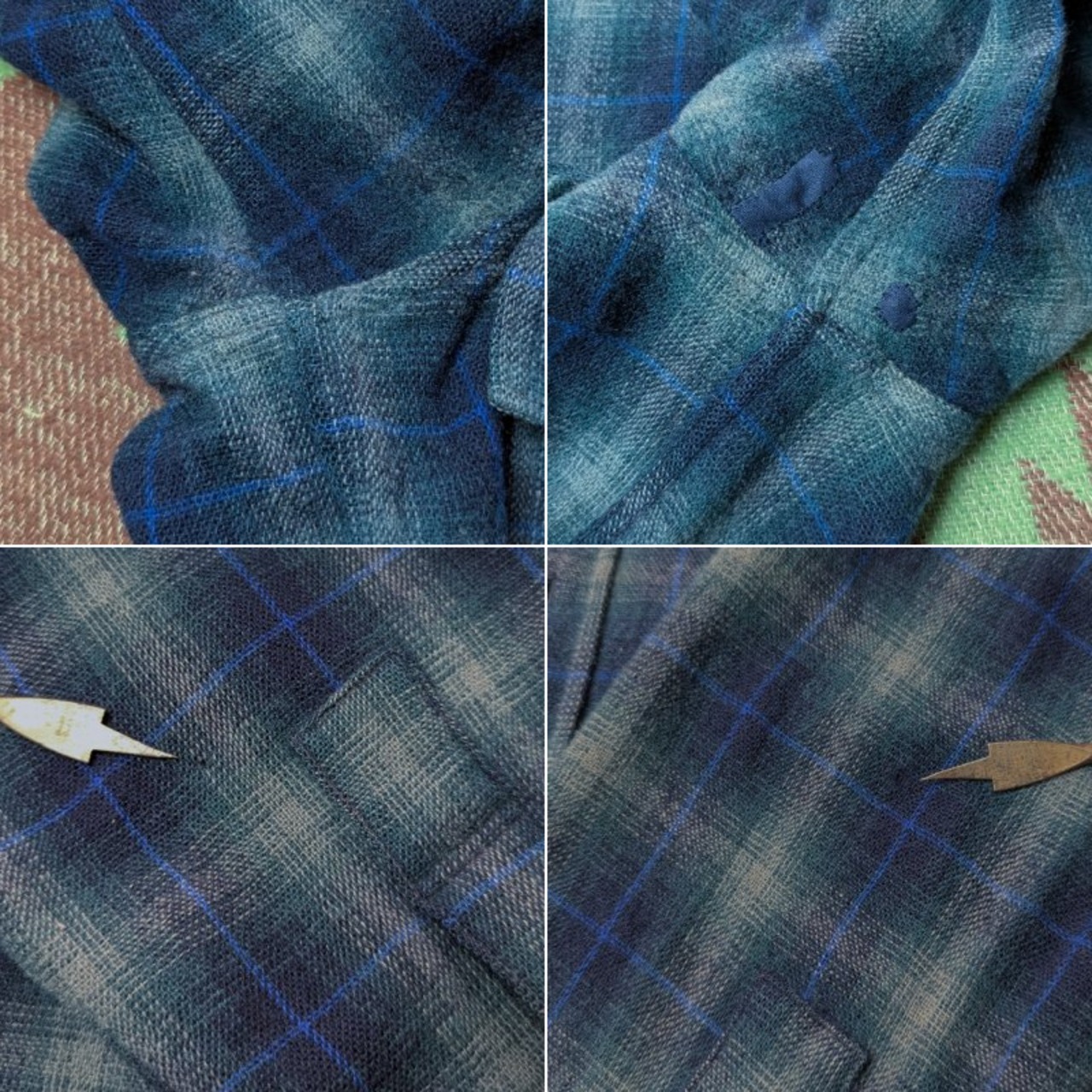 多数のリペアがあり、右ポケット横に摘まんだ部分や袖口・脇は当てた生地が出ていてやや目立ちますが、表からはわからないものも多いです。肘など未リペアのダメージもあります。おそらく首内側の黒い生地もリペアされていると思います。問題なく着こなせるヴィンテージ古着慣れされた方は多くいらっしゃると思われるコンディションです。