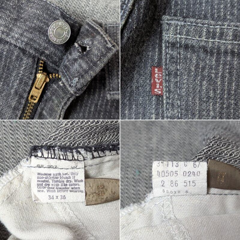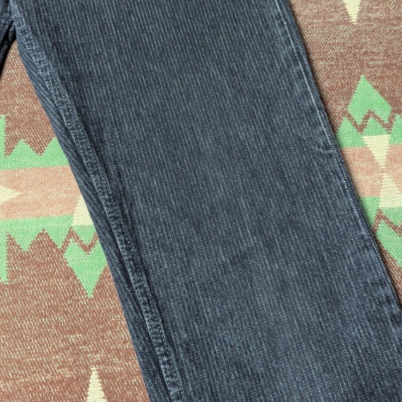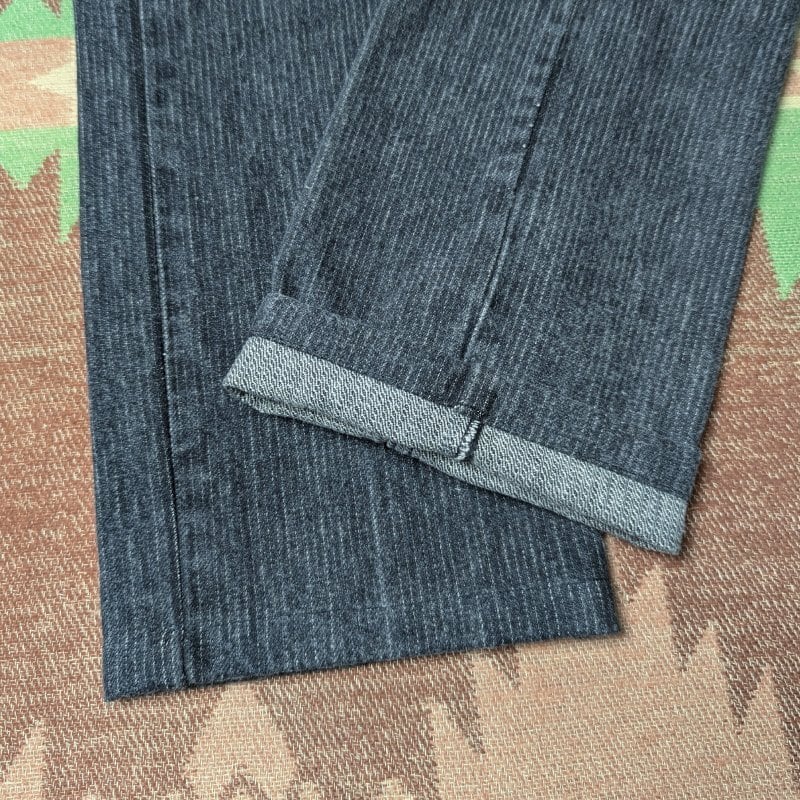 ザクザクとした織りのストライプ、いわゆる先染めのブラックデニム生地を使用した、505(40505)です。