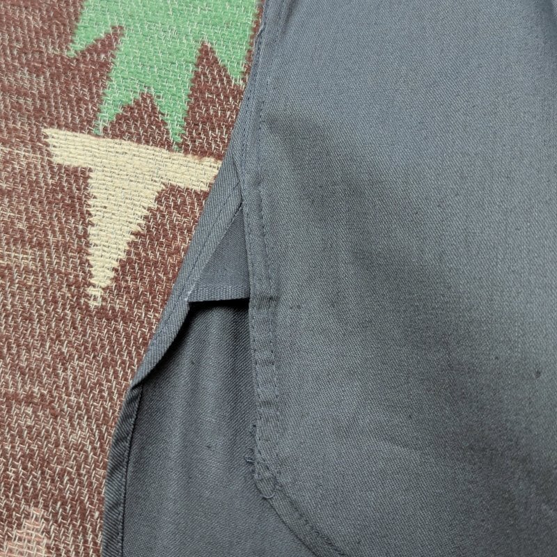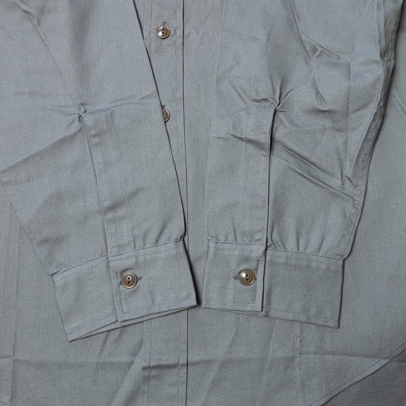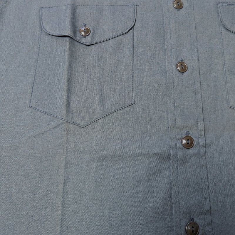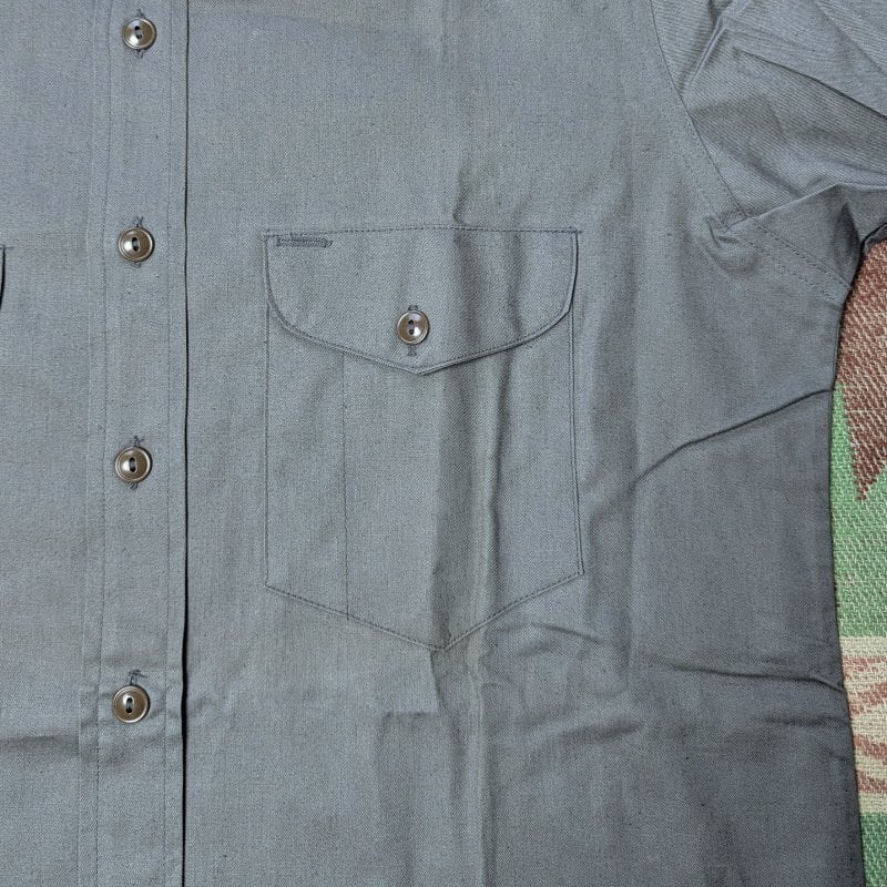 同タイプのユニフォーム系ワークシャツでいえば、割と多いチノシャツと比べるとやや薄手、アーミーツイルとポプリンの中間くらいの生地感です。