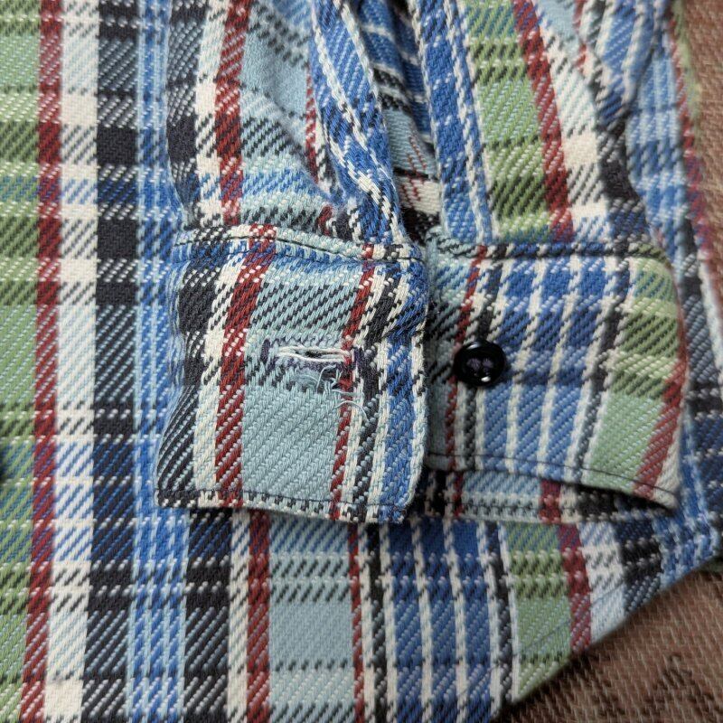 胸元の前立て裏側にほつれ(ボタンを留めると見えない部分)、ポケット角や袖ボタンホールにほつれダメージ、接着タグ剥がれ、右腹に塗料のような付着がありますが、ヴィンテージ古着慣れされた方でしたらそれほど大きな問題ではない程度と思います。全体的には生地は十分にしっかりしていて、襟・肘・袖口等もダメージはなく良い状態です。