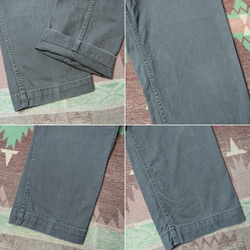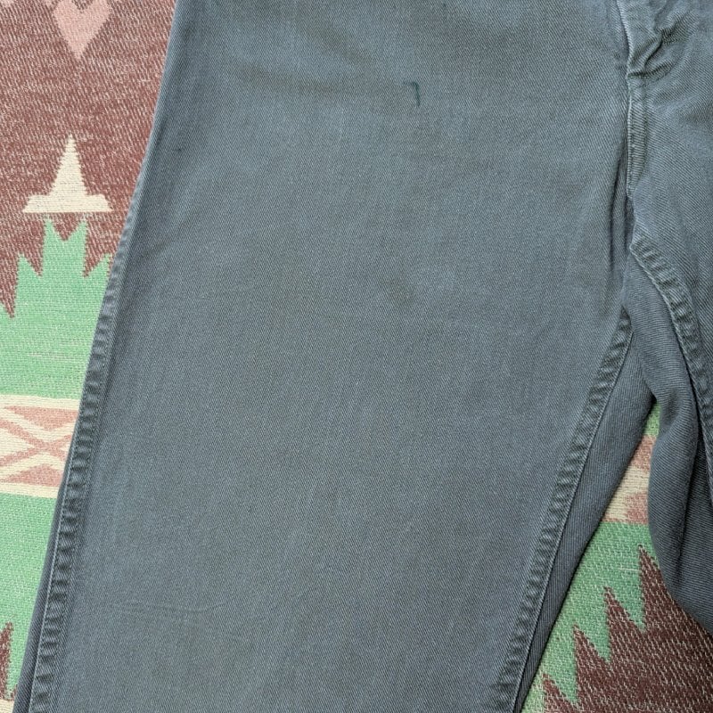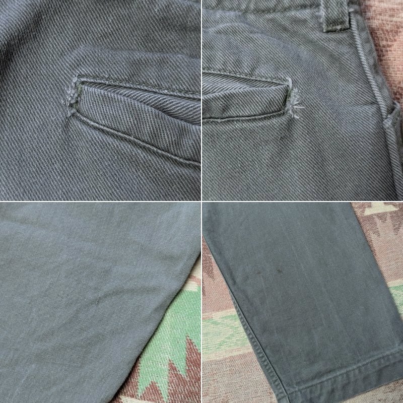ヒップ上部を詰めてサイズ直しされています。右脚付け根に塗料付着、その他ところどころくすみやシミ汚れは見られますが、アジと捉えられるものと思います。ポケットの端に若干ほつれダメージ・いくつか織りむらキズはありますが、大きなダメージはなく、生地は厚くとてもしっかりした状態です。