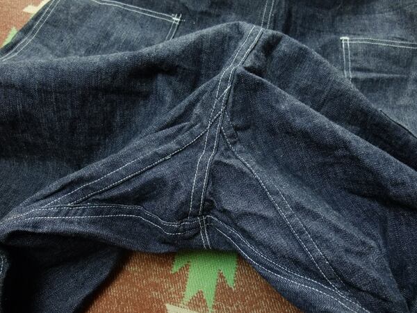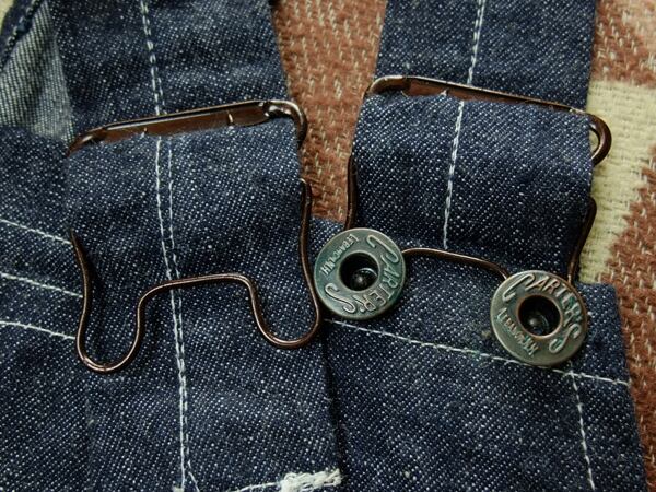 20年代~のカーターズ・デニム オーバーオール。ビブ左に縦長五角形の1ポケット、サスペンダー金具は針刺しのダブルボタンフック、右サイドのツールポケットセパレート、股下三角マチ、メインシームダブルステッチ。