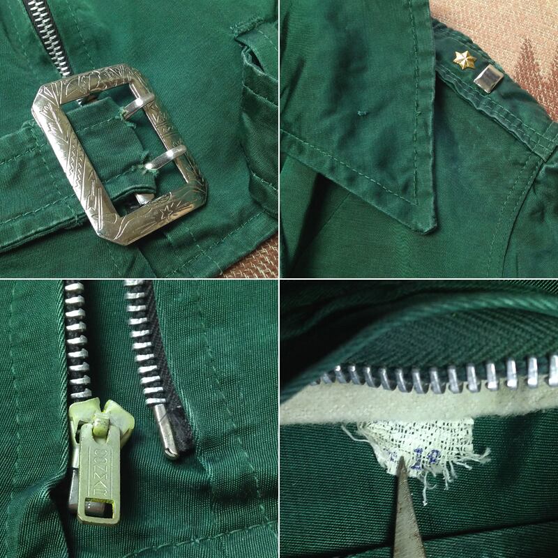 水洗いされていると思われ、全体的なシワやアタリ・若干の縮みなど見られます。襟や袖などに黒っぽいシミ、袖口などに擦れ、そのほか小キズや擦れはありますが、破れなどの大きなダメージはありません。ヴィンテージ古着慣れされた方でしたら、十分着こなせる範囲内のコンディションだと思います。