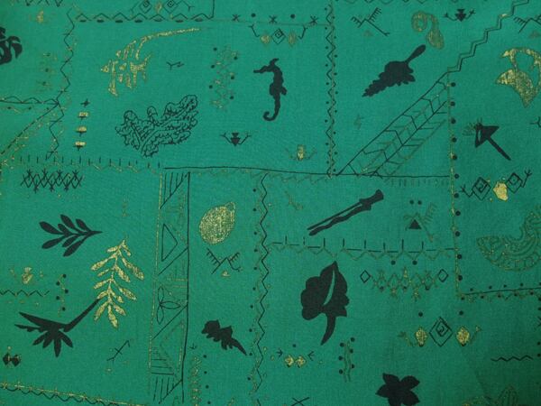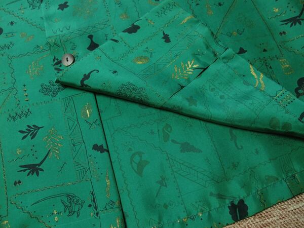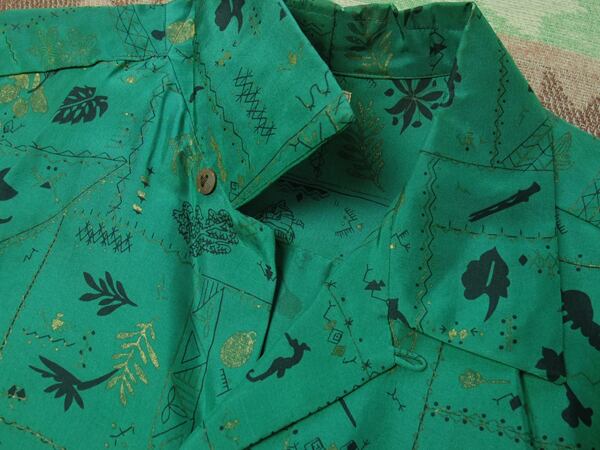 50年代のリバティーハウス・半袖ハワイアンシャツ。エメラルドぽいグリーンのピュアシルク生地に黒と金ラメのプリント。魚や貝殻など海に関係した絵柄、ウクレレが入った柄はお好きな方いらっしゃると思います。袋襟、トップボタンはループ留め、ココナッツボタン。