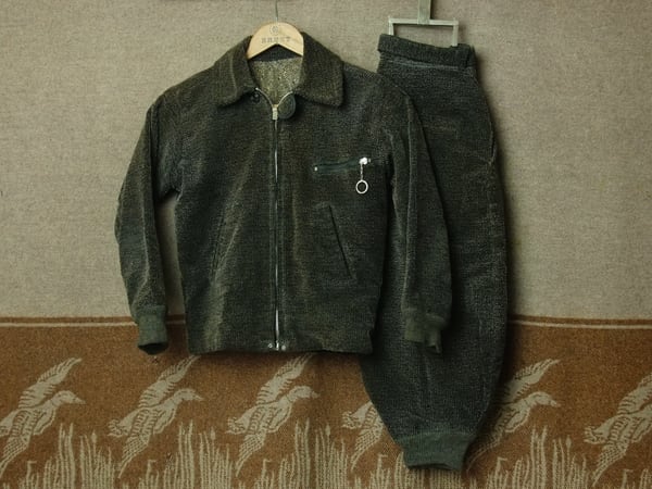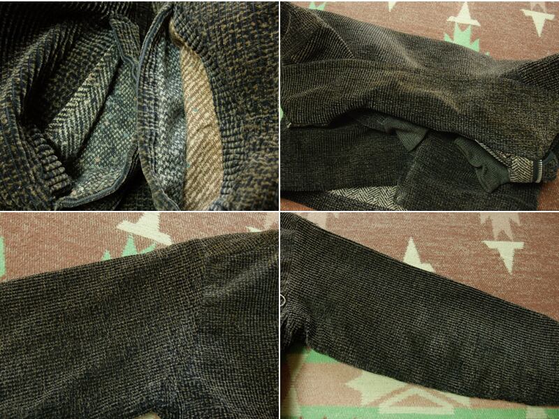 黒×茶系のプリントコーデュロイ(おそらくTWEEDUROY)生地。ジャケットのポケット中や裏地にランダムに使用されたプリントフランネル生地も良いですね。ジャケットはフロントにハトメTALONジッパー、胸ポケットにKOVER-ZIPを使用。同年代のメンズと同様のスポーツジャケットスタイルです。