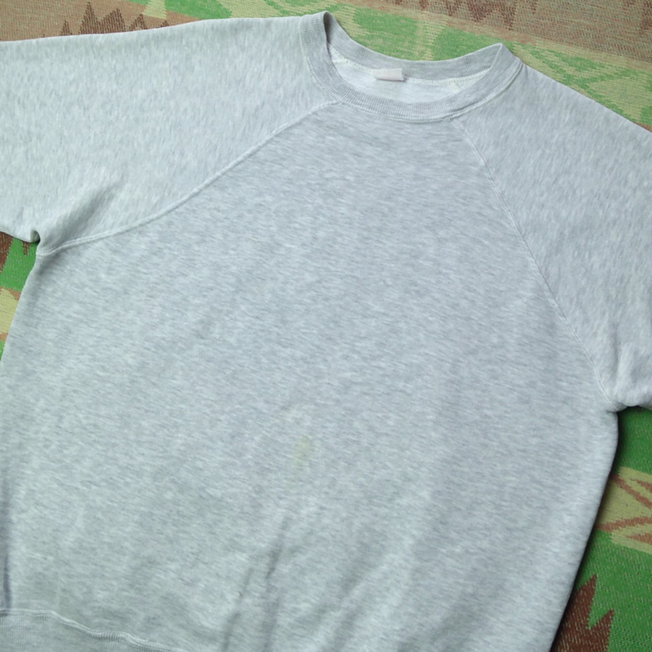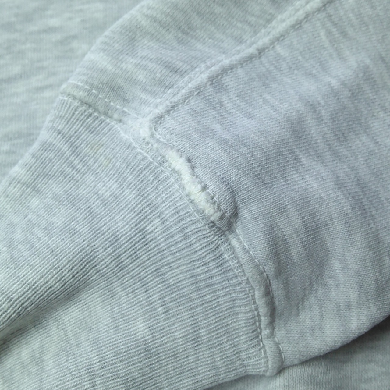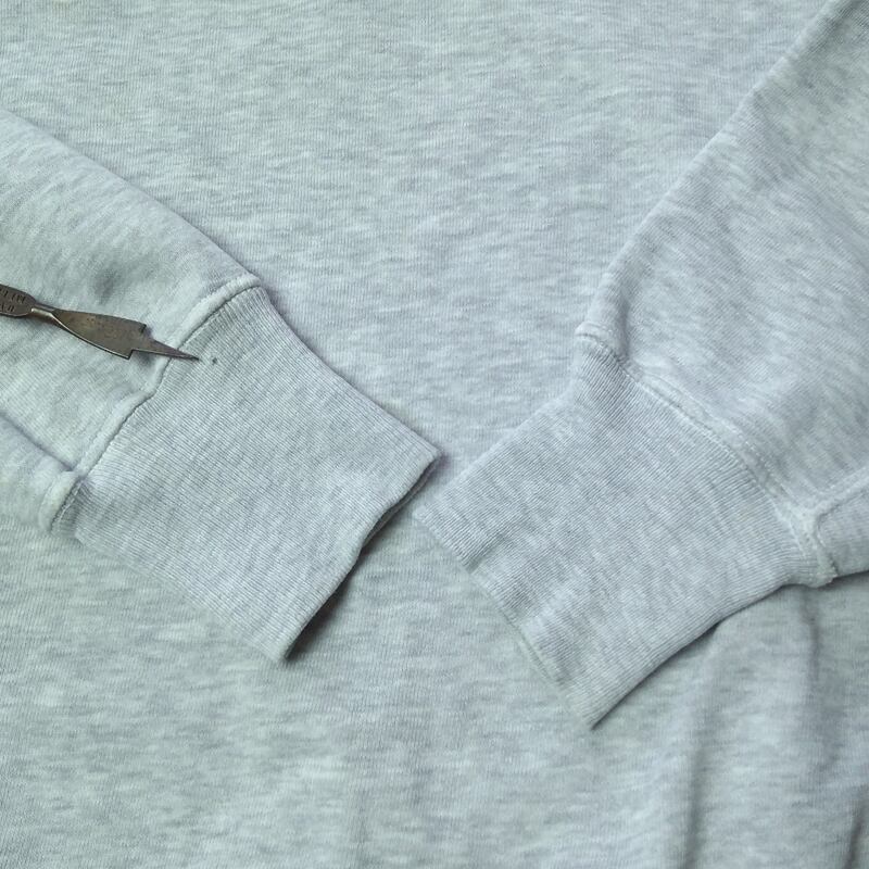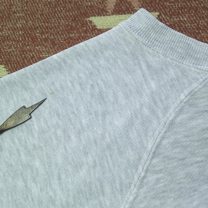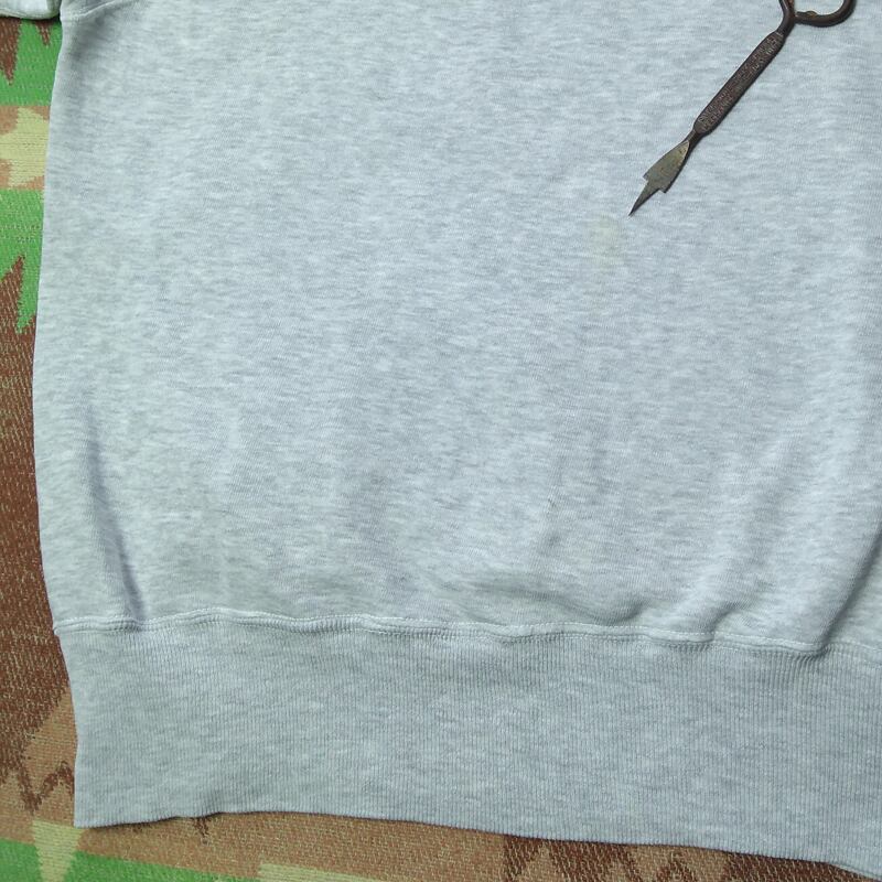 袖などのシーム部分に擦り切れが見られ、左袖リブ付け部分に手縫いリペアがあります。首リブ端・右肘あたり・右袖リブに小さなダメージ、お腹と左肩に薄いシミがあります。ヴィンテージ古着慣れされた方でしたら問題なく着られる、OLDスウェットとしては悪くないコンディションだと思います。