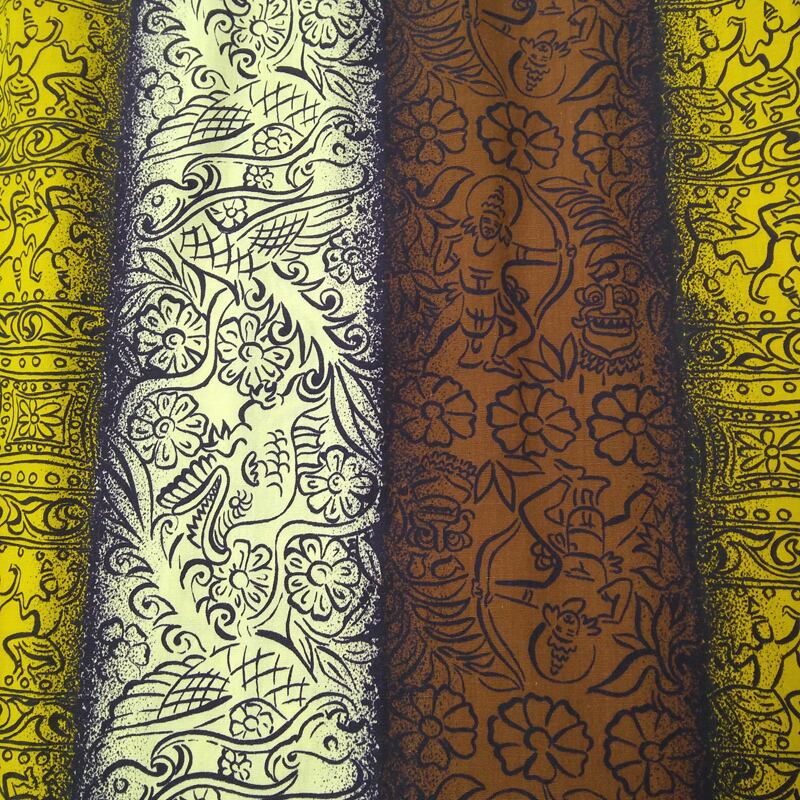 デフォルメされた魚や原住民の絵柄、グラデーションが利いたワイドストライプパターンです。