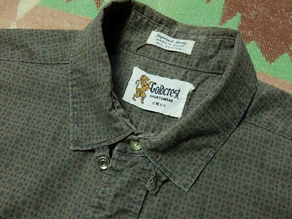 60年代のゴールドクレスト・半袖シャツ。小さな花やダイヤなどの小紋柄プリント、100%コットン生地。タブカラー、バックヨークにボックスプリーツ、袖口ダブル。
