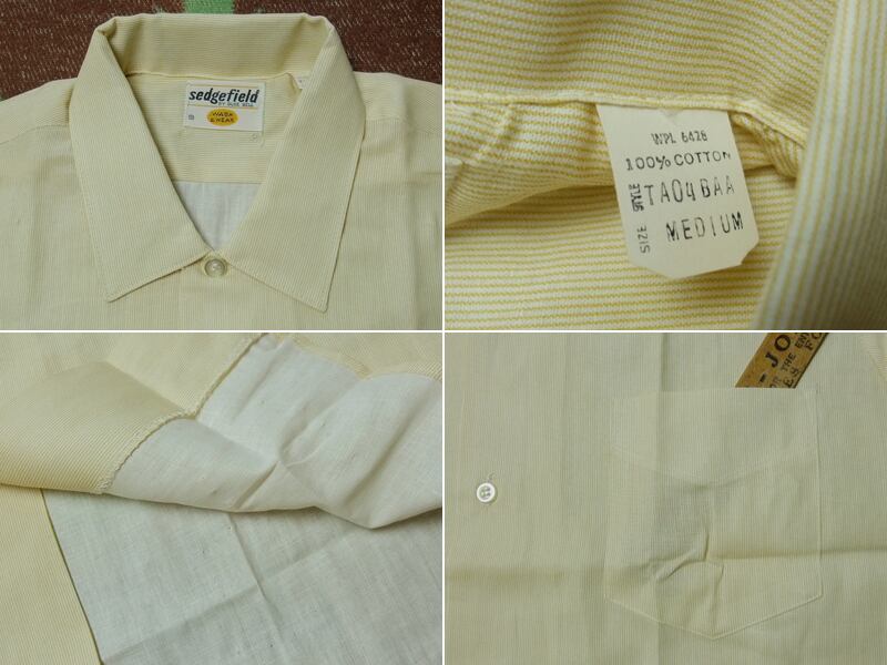 60年代~のセッジフィールド by ブルーベル・半袖コットンシャツ。白ベースにイエローのピンストライプ、100%コットン生地。織りではなくプリントのストライプです。襟はミシンステッチ・プラ芯入り。