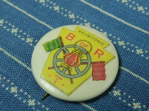 キーストーン・オーバーオールズのアドバタイジング・ピンバック。“ B.R.T. (Brotherhood of Railroad Trainmen) ”、機関車・車輪・ランタン・フラッグの絵柄です。