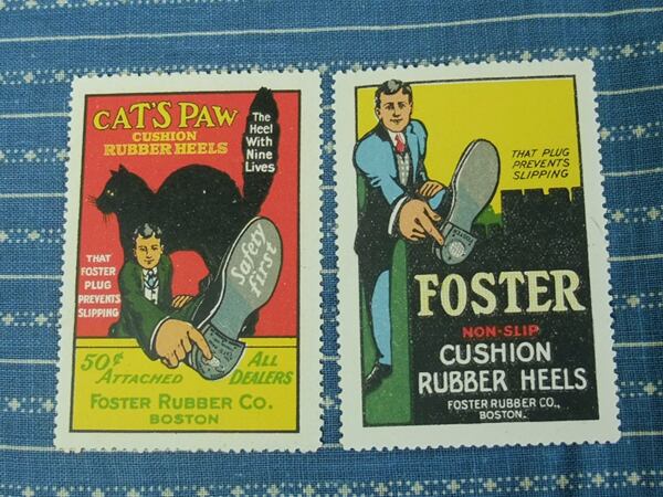 1910年代~のアドバタイジング スタンプ。キャッツポウ ラバーヒールを生産していたフォスター ラバー カンパニーの2枚セット。クラシック&レトロなカラーが最高です。