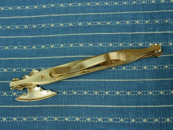 50年代のタイピン。刻印はありませんがアンソン製でしょう。ゴールドトーンのメタル製。斧(まさかり)モチーフ、中央が開いていてネクタイを貫通しているように見えるデザインです。1949年のパテントナンバー刻印。