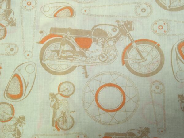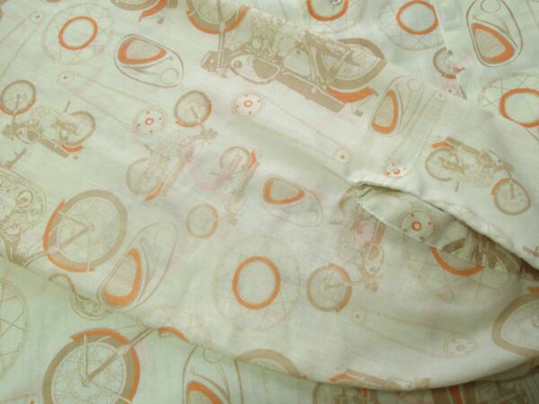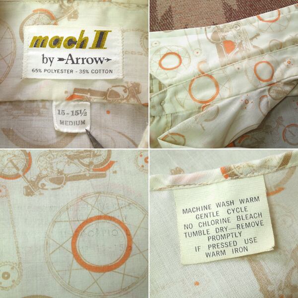 70年代のアロー マッハ2・長袖シャツ。ホンダ ドリーム(CB72/CB77)総柄プリント、65%ポリエステル×35%コットンの薄手の生地。プラ芯入りの大きな襟、ユニオンスタンプ入り。