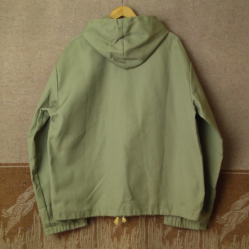少し白っぽいオリーブグリーンのダック生地、50%ポリエステル×50%コットン。
