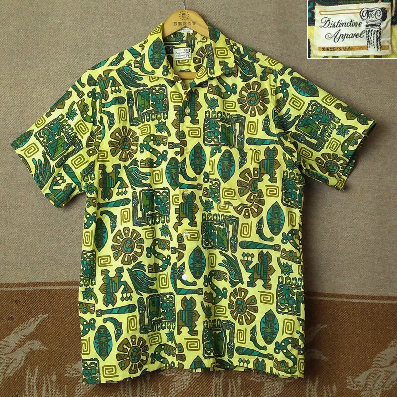 60年代のディスティンクティブ アパレル・半袖コットンシャツ。やや開いた襟で根元にボタンがない開襟スタイル、角度を調整できる板状の芯入り。表記ありませんが100%コットン、サッククロスのようなやや厚手で粗い生地感です。