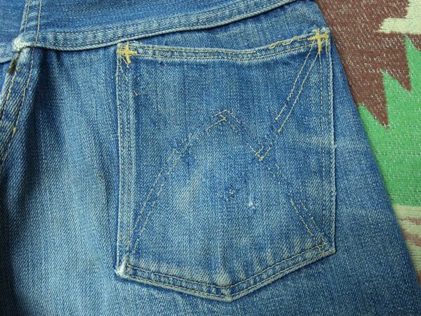 見かけない上下からV字がクロスしたヒップポケットのステッチがポイントです。もう少し大きめサイズであればもっと高額になりますので、サイズが合う方にはオススメです。