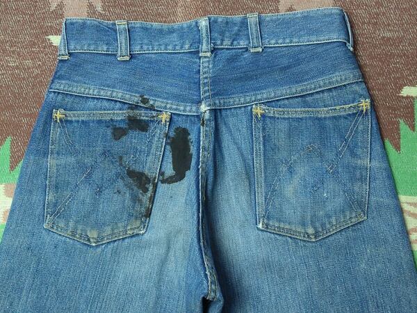 おしりや左足などにオイルのようなシミや全体的なシミ汚れが見られますが、アジと捉えられるものと思います。フロントポケット入口に若干の擦り切れ、ヒップポケットや太ももに小さなダメージはありますが、大きな破れなどのダメージはありません。裾やポケットなどにステッチ抜けや浮いた部分があり、股下からヒップにかけてやサイドシーム裾近くはステッチを入れ直して補修されています。あまり丁寧ではありませんが問題なく穿ける状態です。