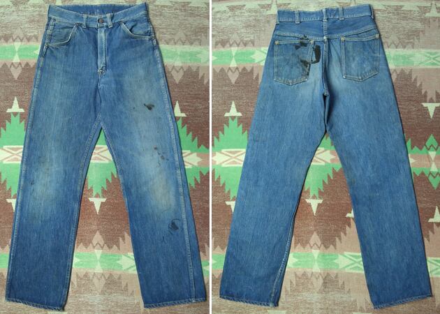 50年代のデニムジーンズ。はっきりした縦落ちが見られる右綾デニムとイエローステッチのコントラストからヴィンテージらしさが感じられます。PRENTICEピンロックジッパー。