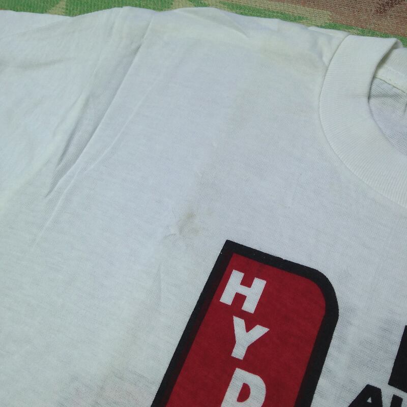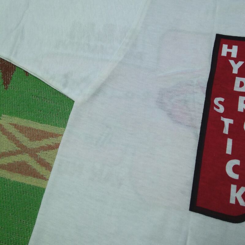 デッドストック。検品・採寸のために袋を開封しました。外れていますがシールも残っています。正面プリント右に小さな赤い点・裾にうっすら赤味・背面プリント左にうっすらプリント移りが見られます。そのほか、畳みシワなどに薄いシミ汚れはありましたが、これらは一度あるいは数回の洗濯でほぼきれいになる程度です。プリント移りについては完全に落ちるかはわかりませんが、ヴィンテージ古着慣れされた方でしたら気にせず着られると思います。