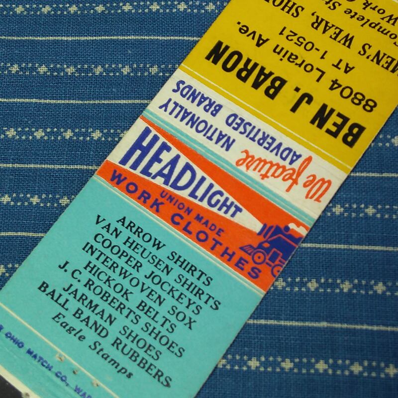 40年代~の≪ヘッドライト ワーク クローズ≫マッチブック。おなじみの機関車&ライトの絵柄です。アローやヴァン ヒューゼンのシャツなどを扱っていたメンズショップのものになります。