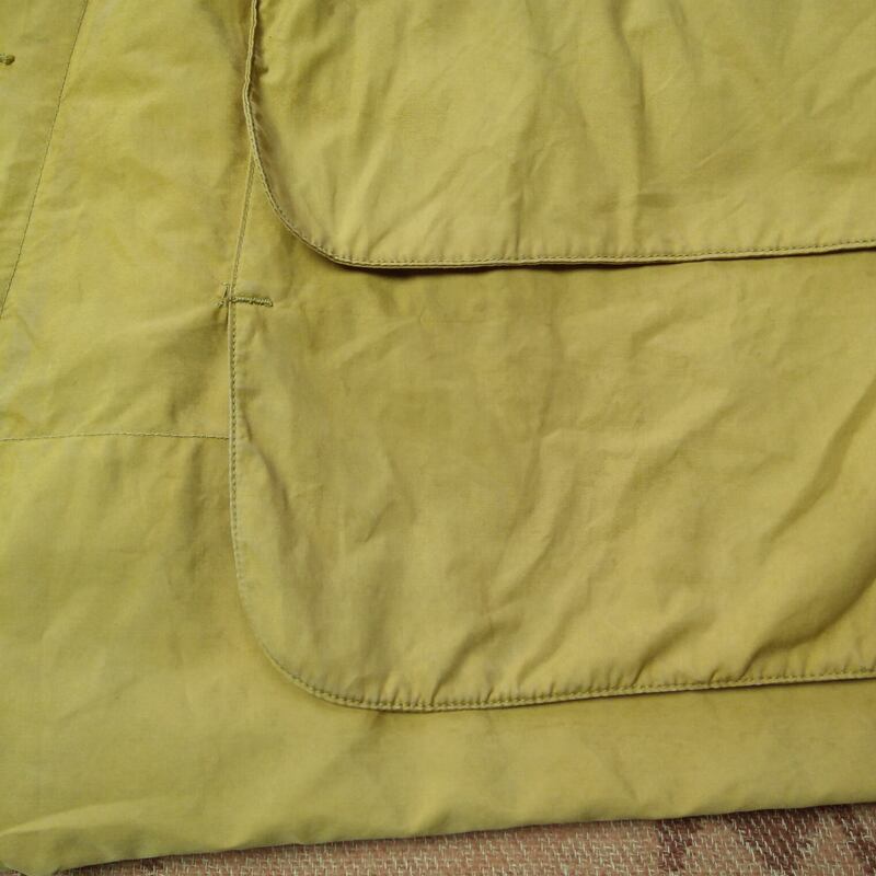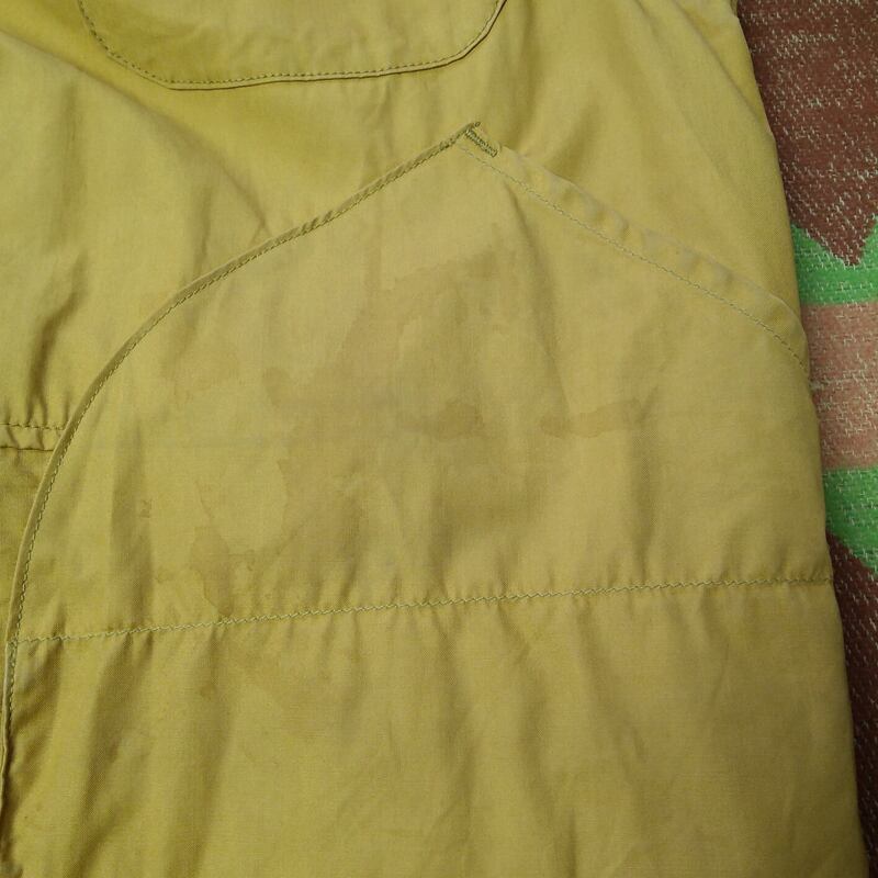 黒ずみ・シミ汚れは見られますが、破れなどの大きな生地ダメージは特にありません。背中にハンティングライセンスを留めていたと思われるピンホールが2つある程度です。洗濯済みですので概ねクリーンな状態です。画像から全体の雰囲気はおわかりいただけると思います。ゲームポケットも内側コーティングの粉末状の剥離は見られますが、外見でわかるようなひどいシミはありません。時間と手間をかけて擦り落とせばもっときれいにすることは可能と思います。