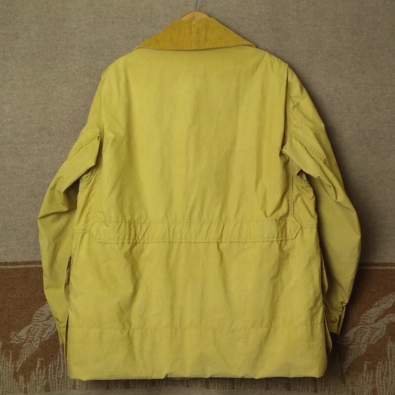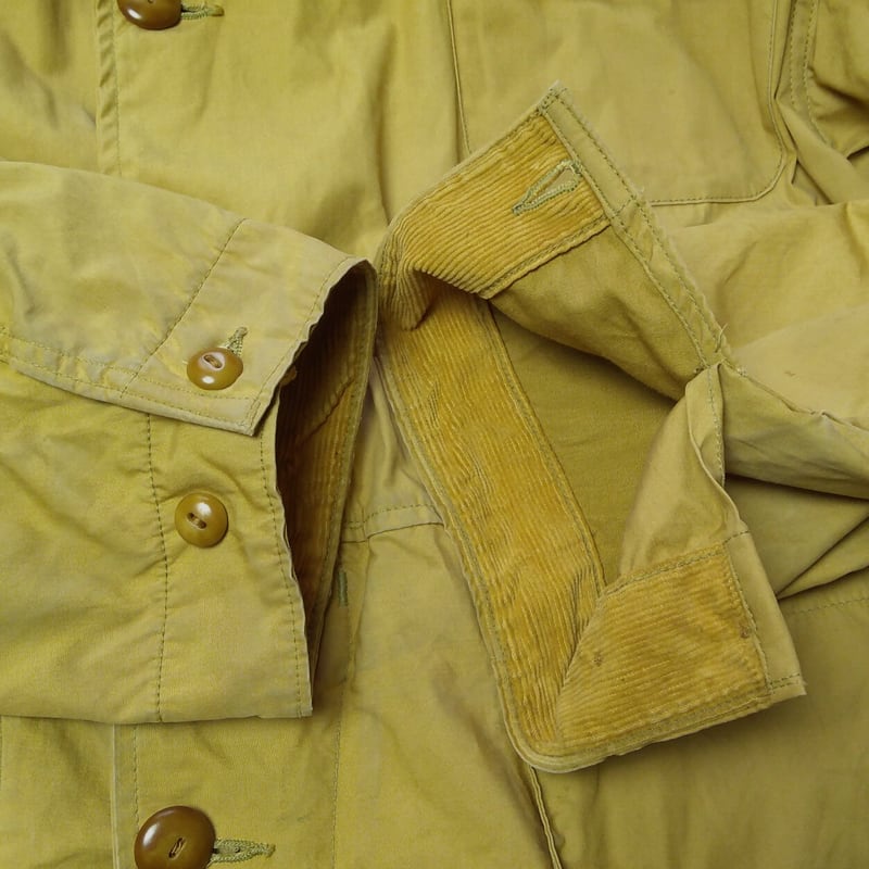 タフタのように薄手でシャカシャカした生地でこのような型のハンティングジャケットでは他に見ない生地を使用しています。このあたりが別注のポイントであろうと推測します。ボタンもドーム型ベジタブル調の良いボタンです。