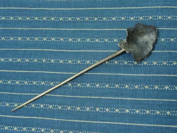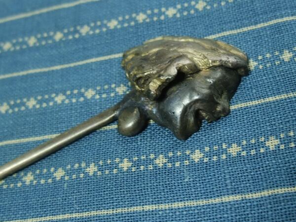 アールヌーボーな雰囲気の笑う女性モチーフ。おそらくスターリングシルバー製、髪の部分はゴールドトーン。ピンの部分はやや長めで大きめのサイズ感です。正確な年代特定はできませんが、少なくとも数十年は古いものと思います。