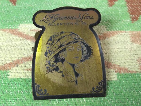 20年代~の≪L.F.Grammes & Sons≫のブラス(真鍮)クリップ。ヴィンテージワークウェア等お好きな方にはおなじみのSTIFELのクリップと同じメーカーのアドバタイジングです。アールヌーボー・ヴィクトリアンなテイストの女性柄。