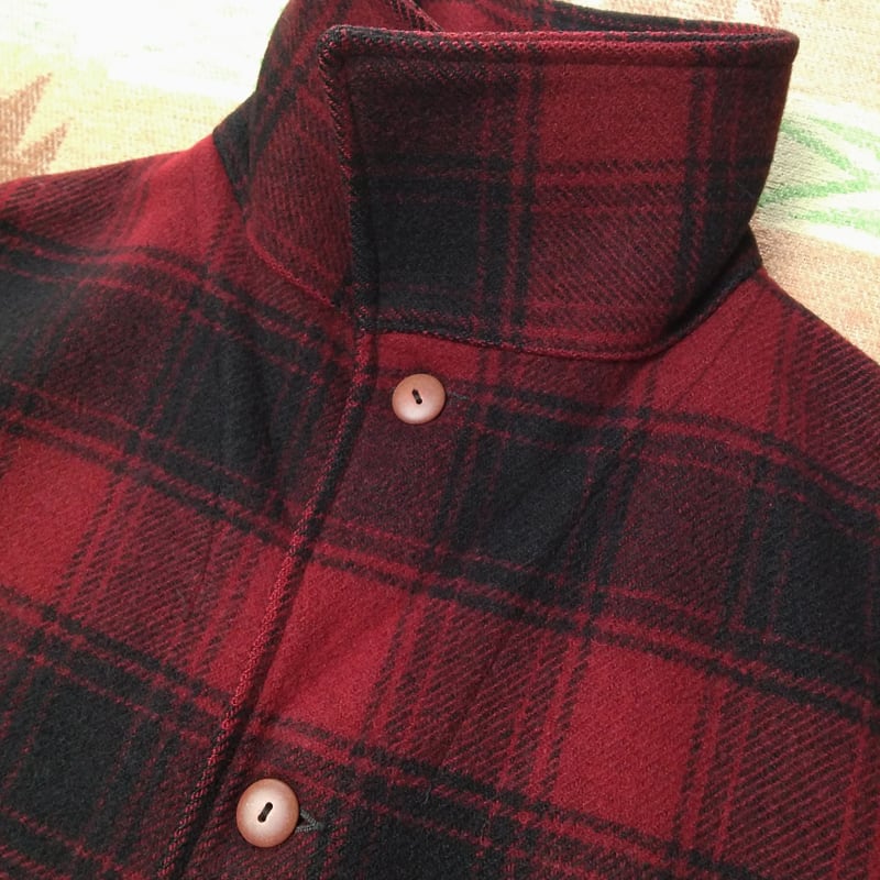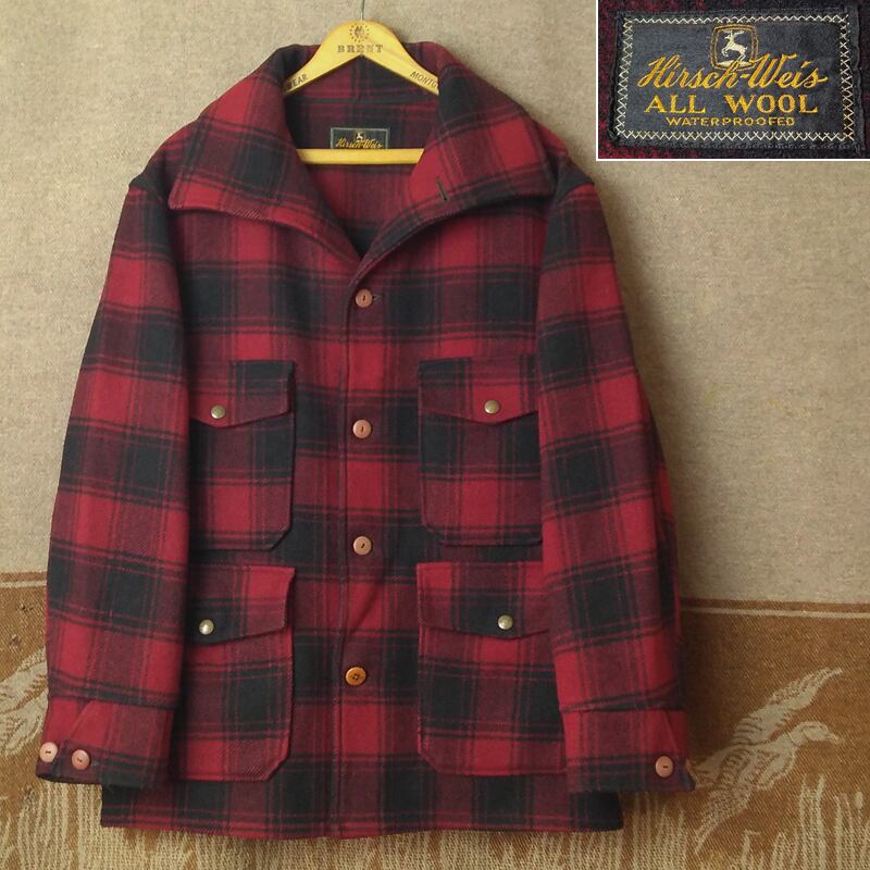 30年代のハーシュワイス・クルーザー。赤×黒チェックのウール生地。フロント4パッチポケット、左胸に内ポケット、腰にゲームポケット。スキージャケット等と同様の浮きロゴスナップボタンを使用しています。