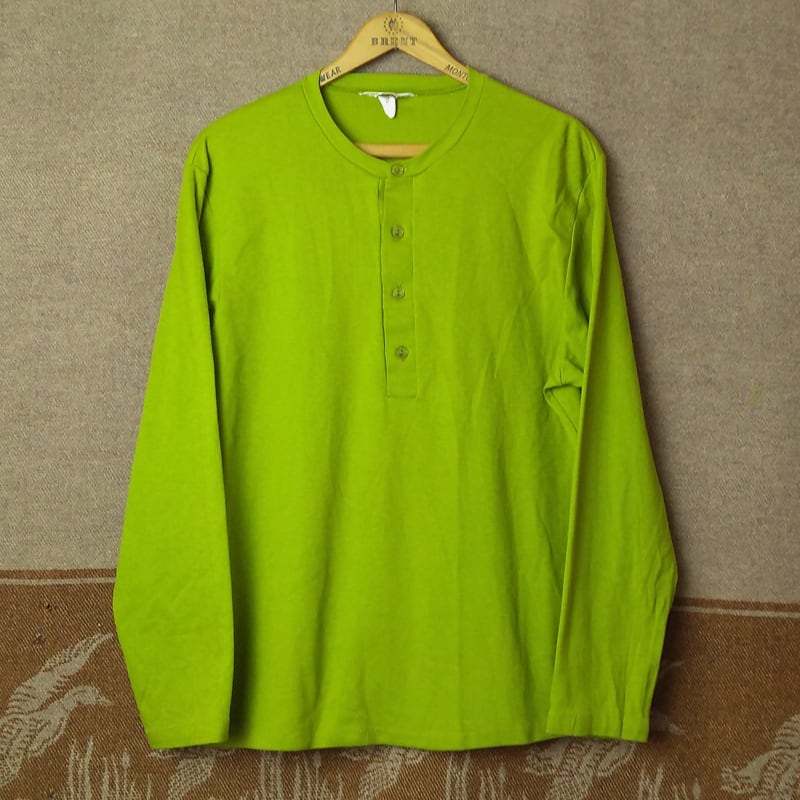 60年代~のタウンクラフト・ヘンリーネック カットソー。シルキーで滑らかな風合い、伸縮性がある100%コットン生地。暗めのライムグリーンあるいは明るめの抹茶色といった感じのきれいな色です。