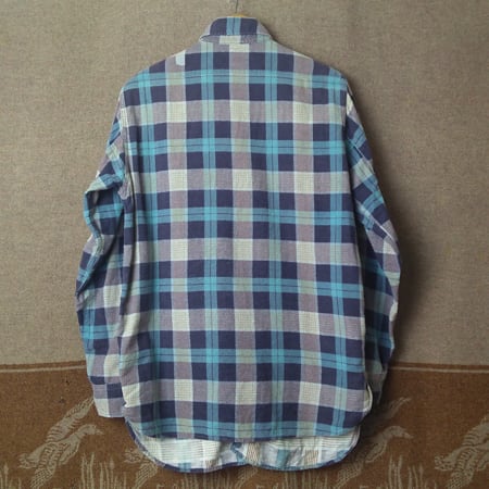 60年代の≪Allied CLOTHIERS≫フランネルシャツ。ブルー系チェックの100%コットン プリントライトフランネル。ロングテイルのワークシャツタイプ、裾は前が長くOLD感あります。裾サイドはマチ付き。