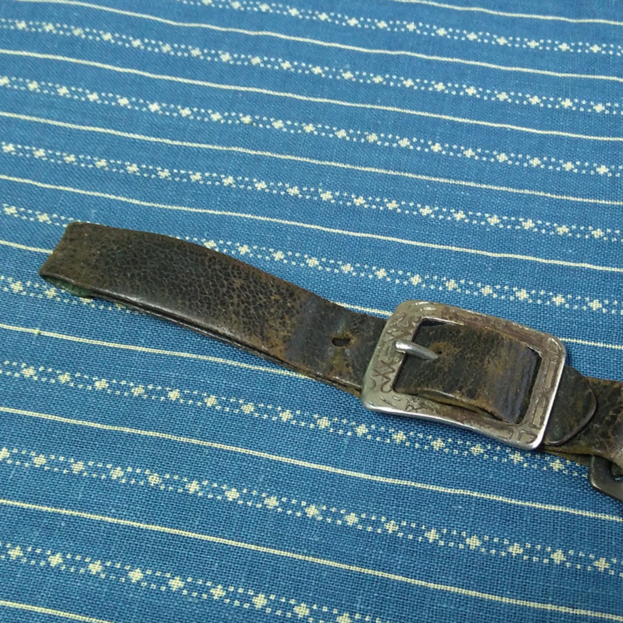 レザーに全体的なくすみ汚れや擦れ・根元を中心に表面剥げ、バックルに若干錆びが見られます。フォブはくすみ・擦れ等見られますがアジのある雰囲気、特に問題のないコンディションです。
