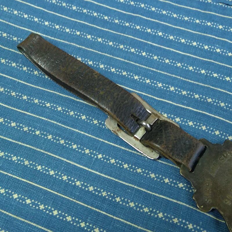 1910年代前後のスカル&クロスボーン・ポケットウォッチフォブ。医療器具メーカーのアドバタイジングと思われます。おそらくブラスなど合金に黒味のあるメッキ。薄手のレザーストラップ付き、柄入りバックル(スチール製)。