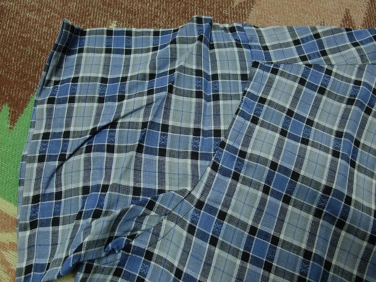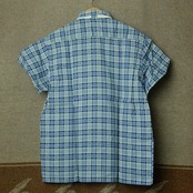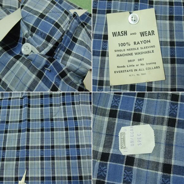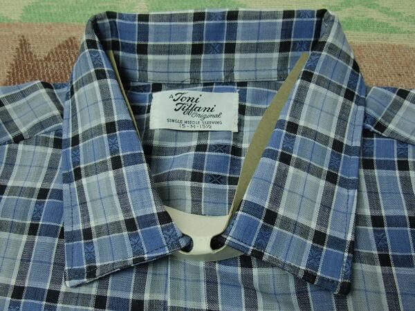 60年代の“ A Toni Tiffani Original ” 半袖シャツ。青・黒・グレー・白のチェックに織り柄入り、少し通気性がある感じの100%レーヨン生地。襟はミシンステッチ・プラ芯入り、トップボタンはループ留め、やや短めの袖丈。