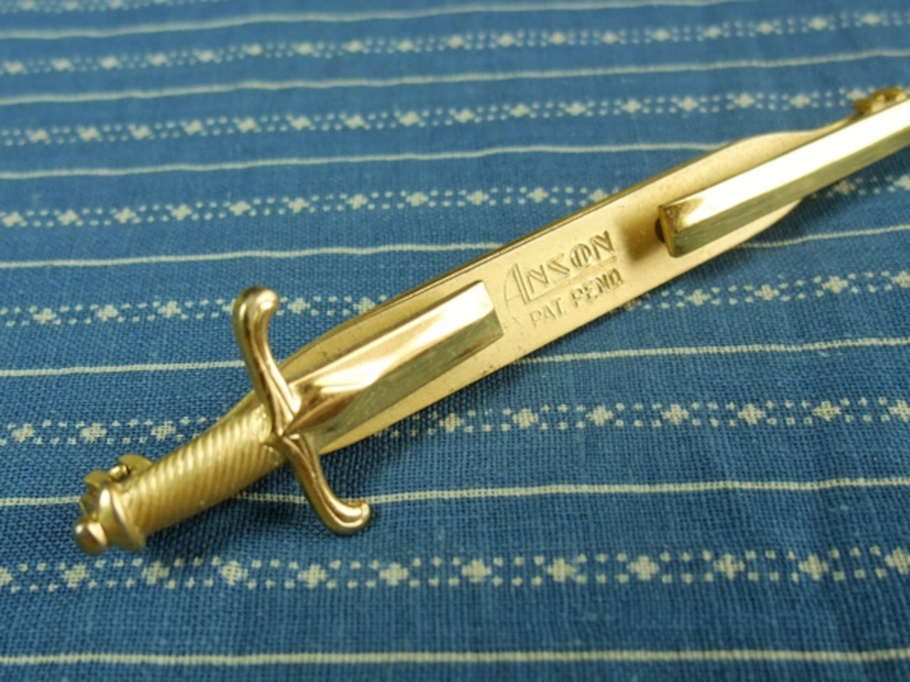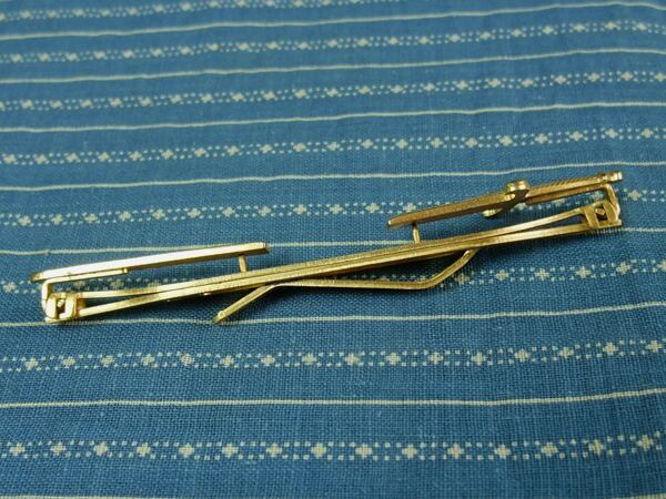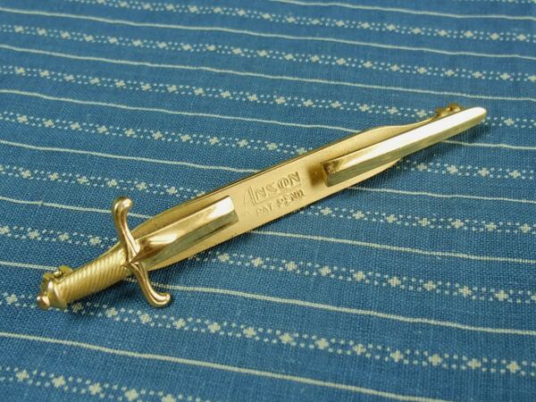 40年代のアンソン・タイピン。ゴールドトーンのメタル製。剣モチーフ、中央が開いていてネクタイを貫通しているように見えるデザインです。“ PAT PEND ”刻印。1949年のパテントですので、40年代末頃のものと思われます。