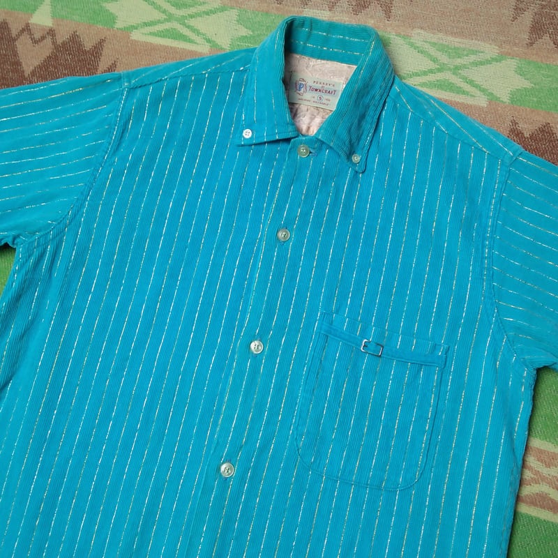 50年代の≪ペニーズ タウンクラフト≫コーデュロイシャツ。ターコイズベースに金銀のラメストライプ。台襟なしのボタンダウン襟。ボタンを外して開けばオープンカラーになります。ポケットと背面襟に飾りのバックルストラップ付き。
