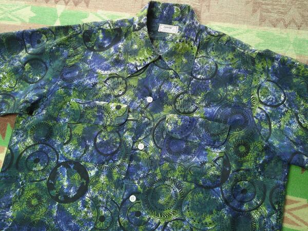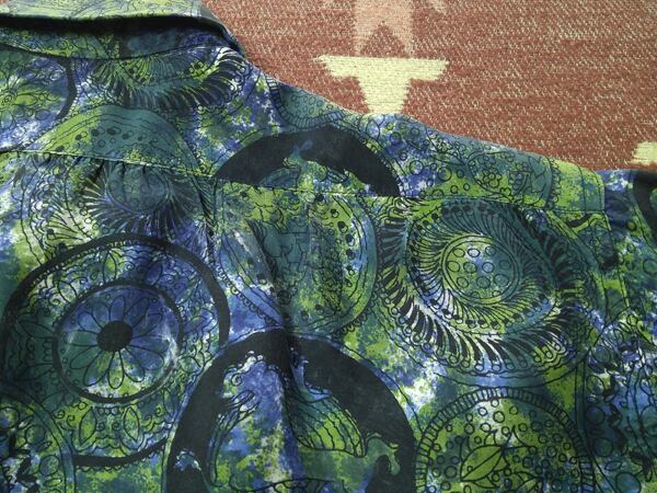 バティック・民族調の染めとオーバープリントで神話の世界を表現したような素晴らしい柄のシャツです。