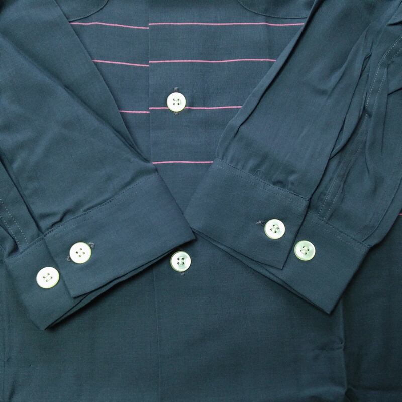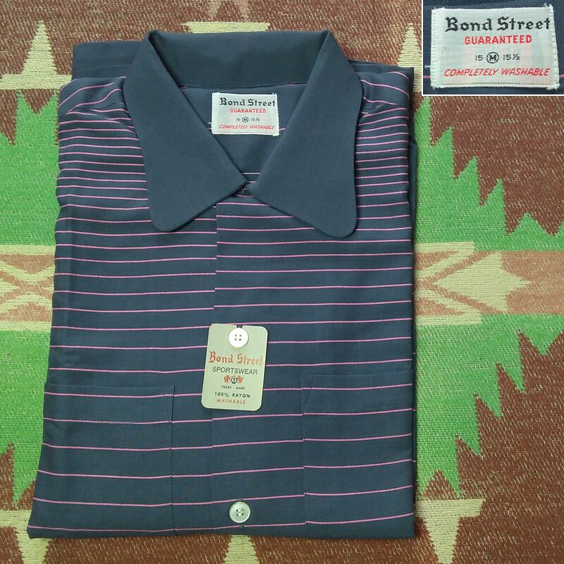 50年代のボンド ストリート・レーヨンシャツ。丸い袋襟、トップボタンはループ留め。