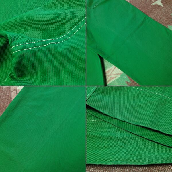 ウエスト背面はゴムで絞られていたようですが現状伸びています。ベルトのハトメが1つ欠損していて他のハトメ周辺にも若干ダメージがあります。ウエスト周辺に茶色っぽいシミ汚れ、太ももから膝にシワのアタリ、左裾に赤い塗料付着、おしりに若干のステッチ飛び、裾に擦り切れなど見られ、そのほか全体的な色あせや薄いシミ汚れがあります。ヴィンテージ古着慣れされた方でしたら十分着こなせるコンディションと思います。