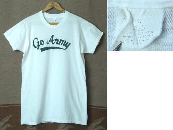 70年代の“ Go Army ”プリントTシャツ。白ベースの100%コットン、表記が薄くなっていますがUNION UNDERWEAR(フルーツオブザルーム)ボディ。現状油性プリントのような雰囲気ですがフロッキープリントだったものと思われます。